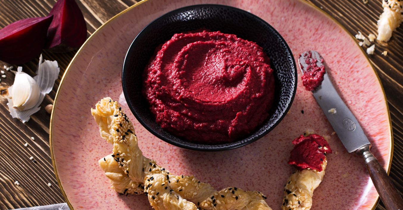 Rote-Bete-Hummus mit Sesamstangen