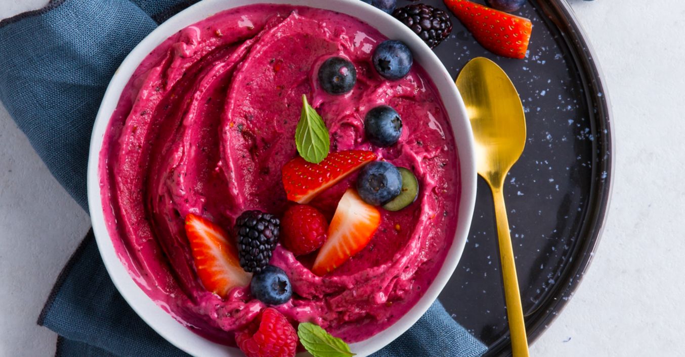 Beeren, Bananen, Mandelmus, Agavendicksaft und Mandeldrink im Mixer zu cremigem Eis pürieren und sofort servieren.