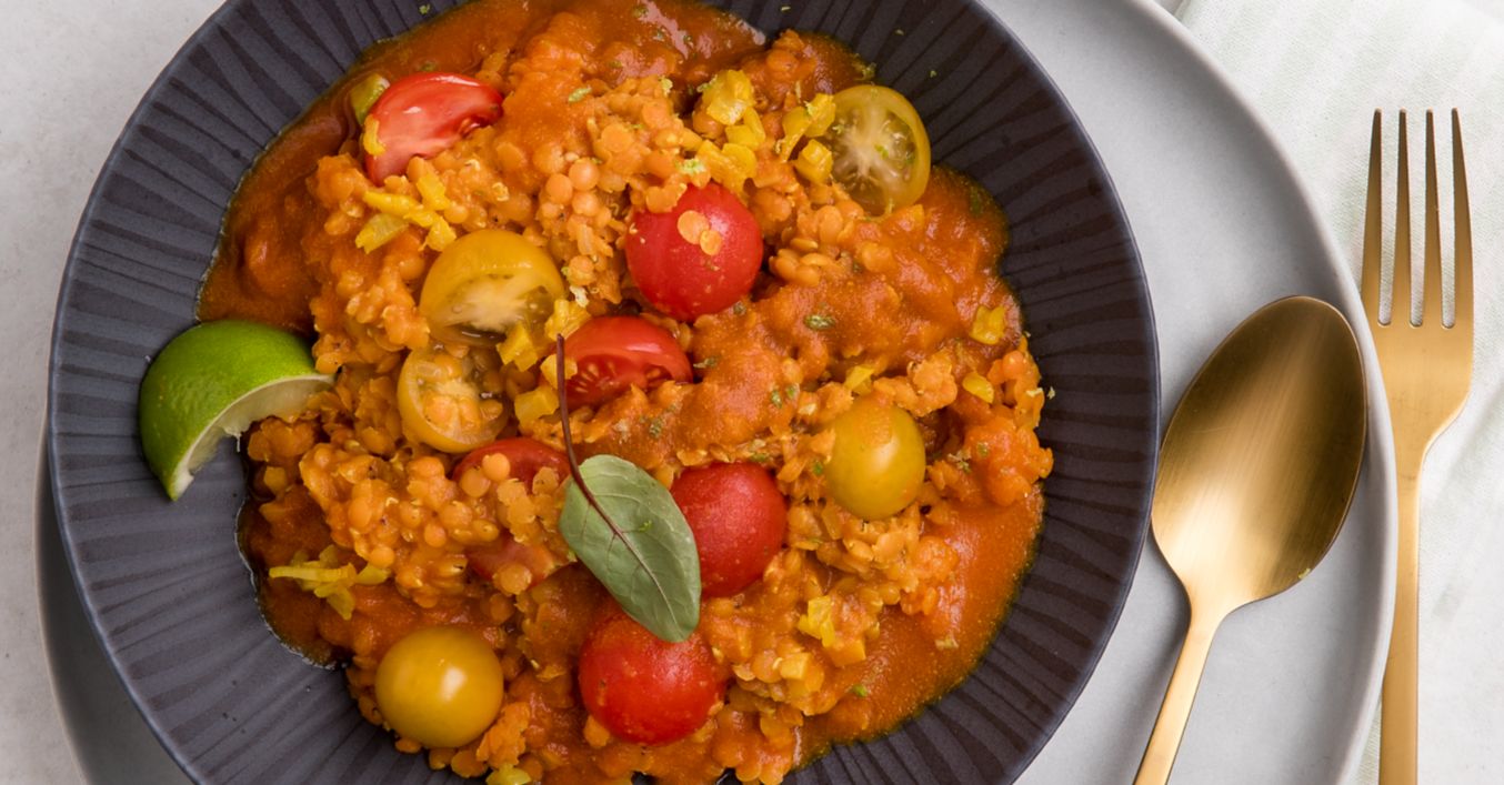 Rote Linsen zugeben, mit Gemüsebrühe sowie passierten Tomaten ablöschen und circa 20 Minuten köcheln lassen.
