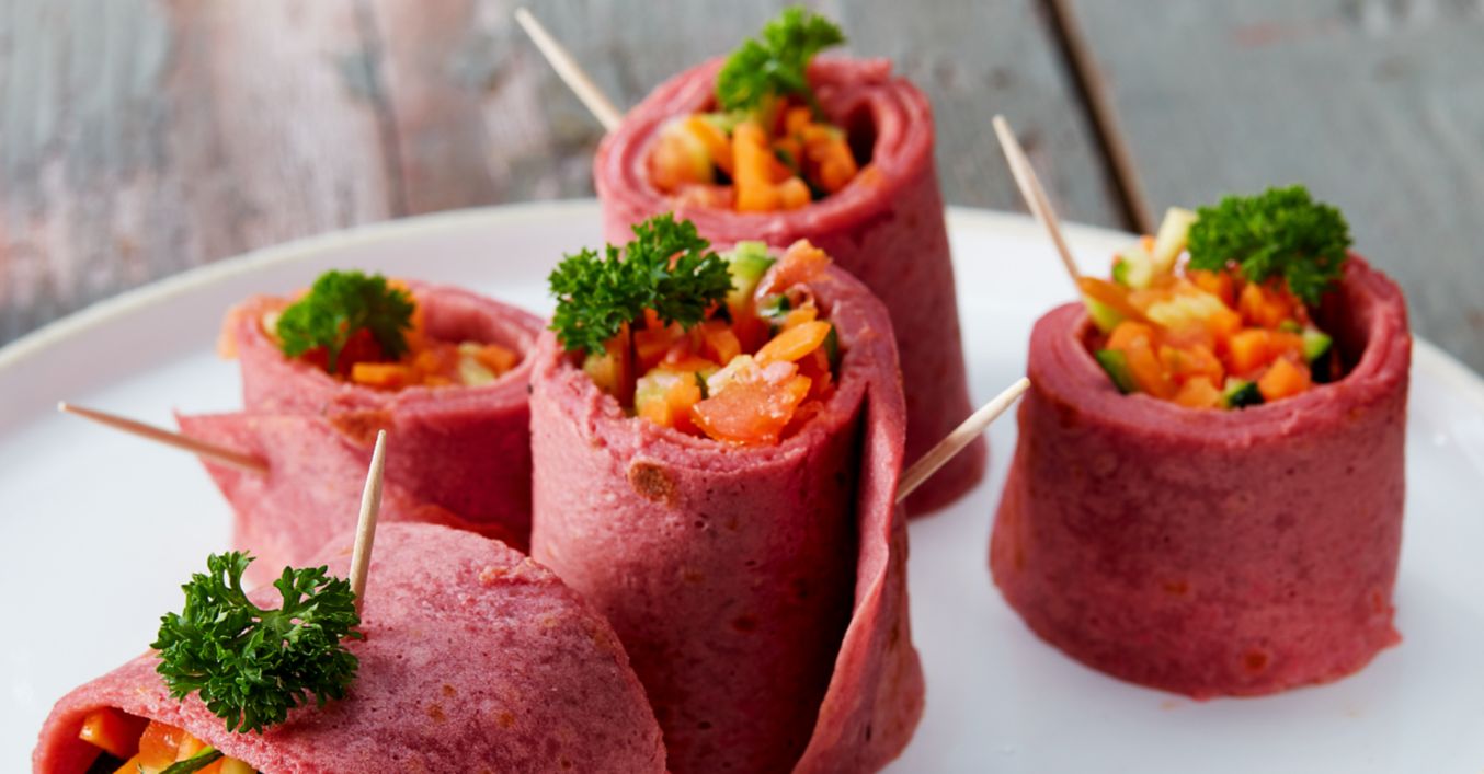 Roter Pfannkuchen mit buntem Gemüse