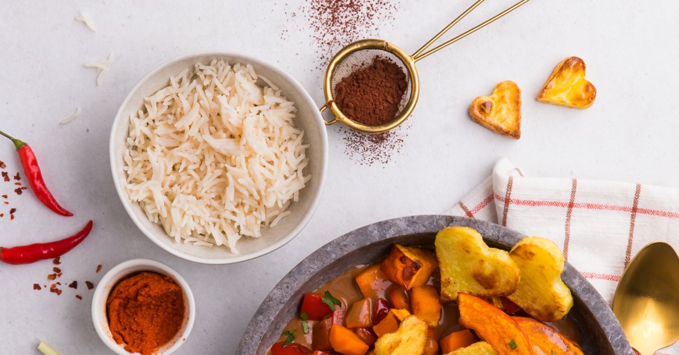 Rotes Kokosmilchcurry mit Kakao und Kartoffelherzen