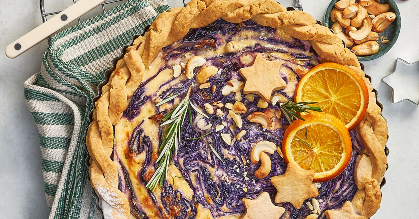Rotkohl aus dem Ofen nehmen, etwas auskühlen lassen und mit Rosmarin, Zwiebelstreifen und Knoblauch vermengen. Die Hälfte der Sahnemischung auf dem Teig verteilen, mit Rotkohl belegen, mit der restlichen Sahnemischung begießen und im vorgeheizten Ofen circa 35 Minuten backen. 15 Minuten vor Ende der Backzeit Orangenscheiben und Cashewkerne auf der Quiche verteilen.