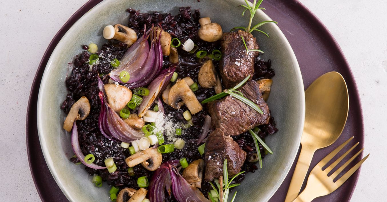 Rotwein-Risotto mit Zwiebeln und Champignons
