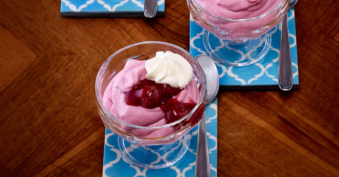 Mit einem Teil der Sauerkirschen und übriger Sahne als Tupfen die Creme garnieren und mit restlichen Kirschen servieren.