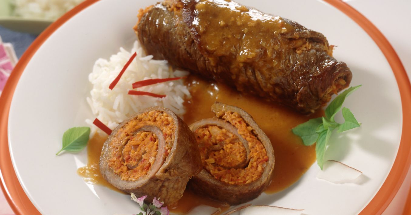 Rouladen mit Salz, Pfeffer und Curry würzen. Die Füllung darauf verteilen und die Rouladen aufrollen. Mit Rouladenklammern oder -nadeln schließen.