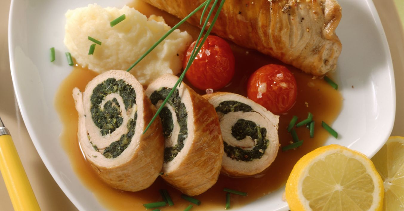 Zitrone auspressen. Knoblauch schälen und fein hacken. Sardellen trocken tupfen, klein hacken. Spinat grob verzupfen. Spinat mit Zitronensaft, Knoblauch- und Sardellenwürfelchen und Muskat vermengen. Spinatmischung gleichmäßig auf den Rouladen verteilen. Rouladen eng aufrollen, mit Rouladennadeln oder Holzstäbchen feststecken.