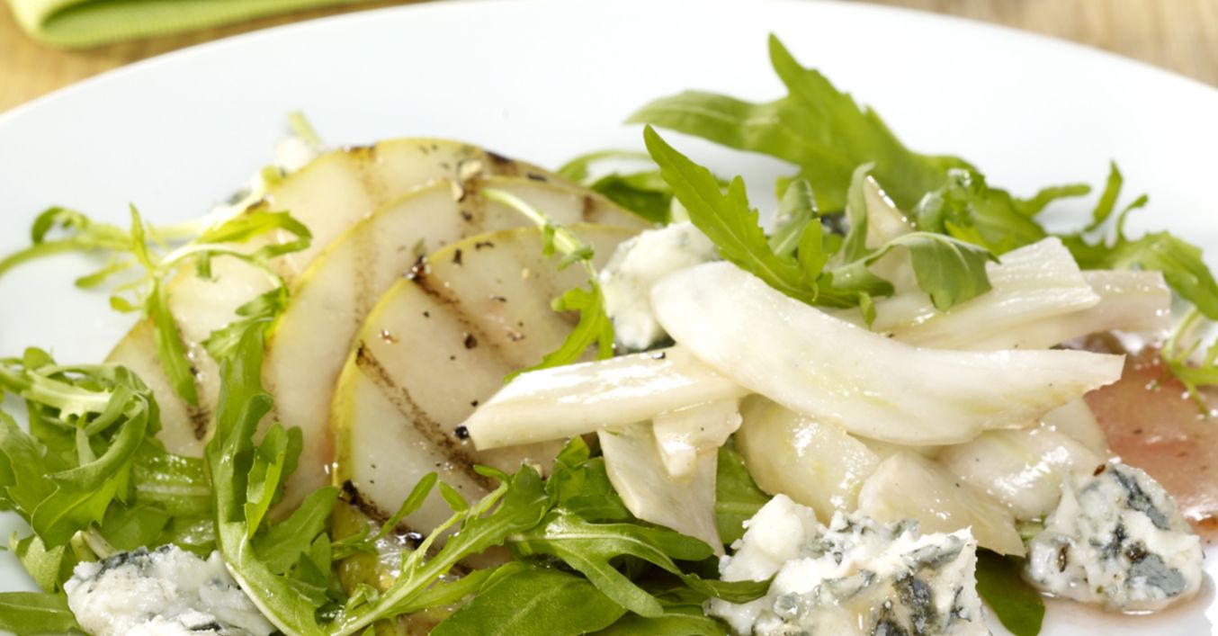 Rucola-Salat mit gegrillten Birnenspalten und Roquefortkäse