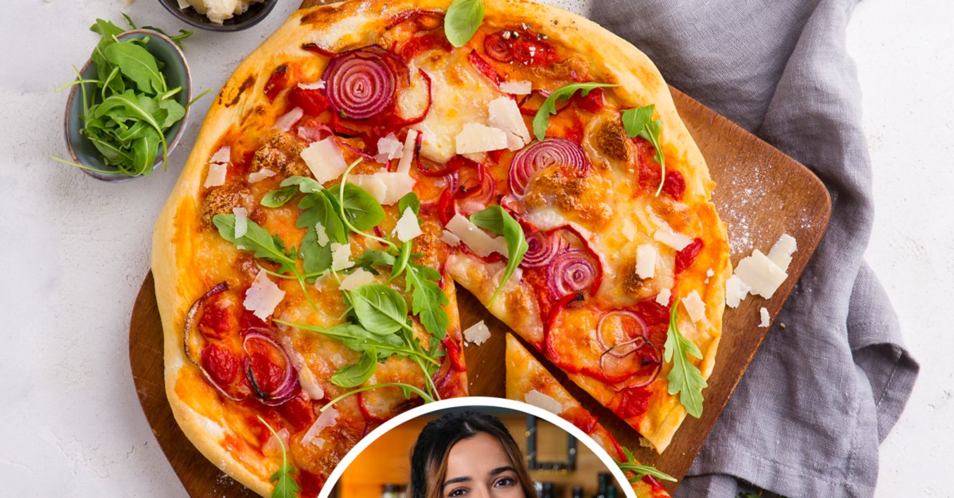 Nach dem Backen die Pizza mit frischem Rucola belegen und mit Parmesanbestreuen.