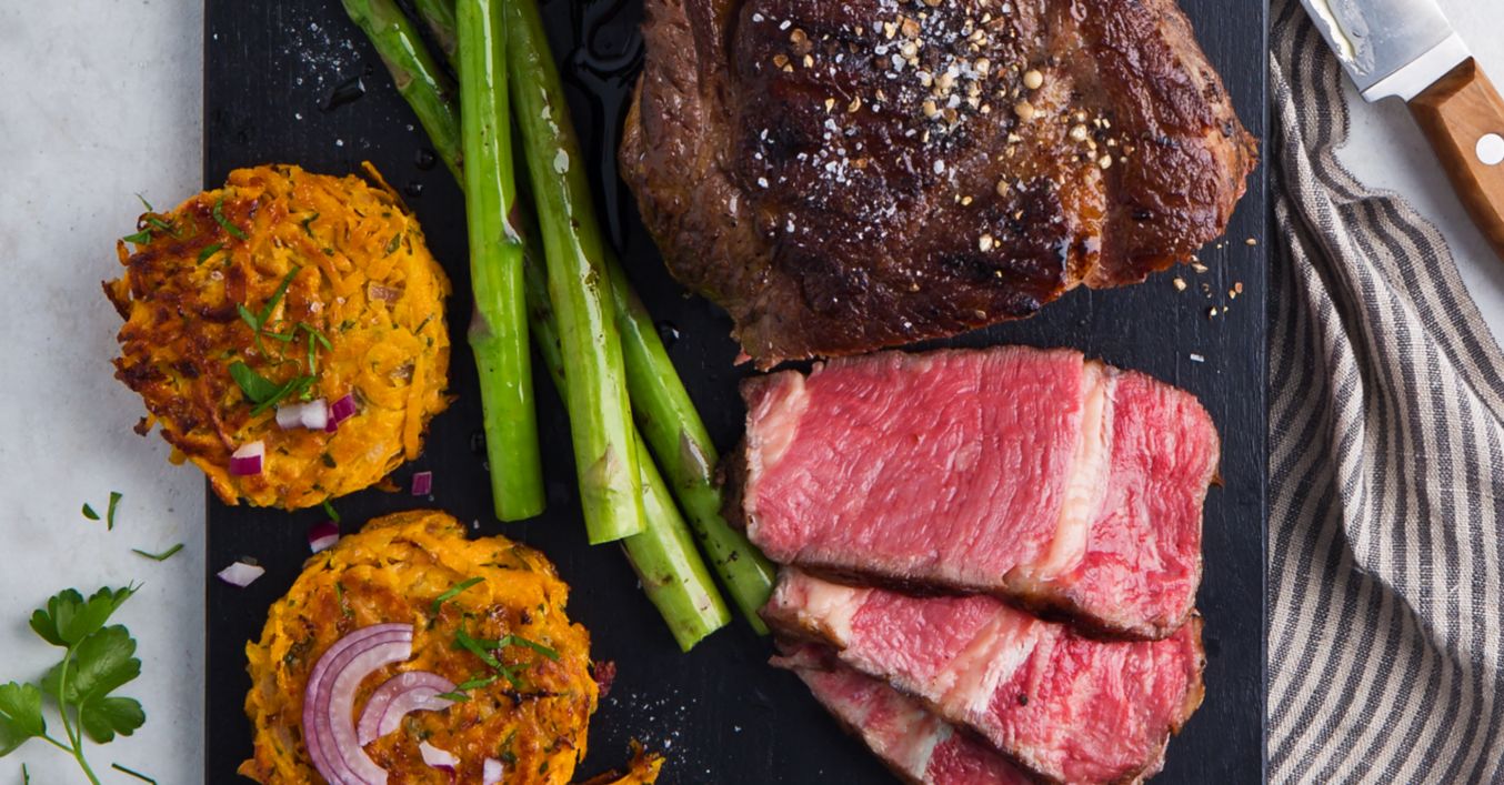 Steak mit Spargel, Butter und Röstis auf einem Teller servieren.