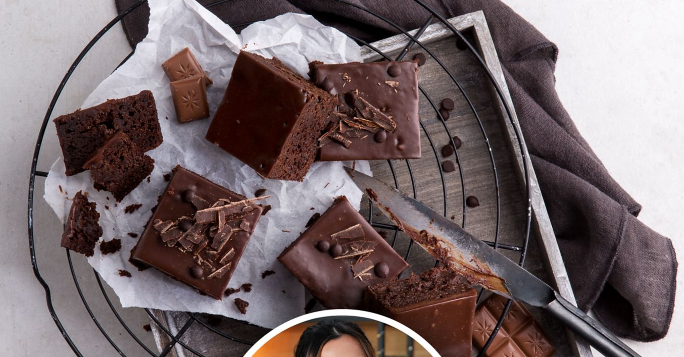 Mehl, Backkakao, sowie Backpulver hinzusieben und zu einem homogenen Teig verrühren. Nun die Schokotröpfchen einrühren. Den Teig in einen Backrahmen (26 Zentimeter x 21 Zentimeter) füllen und im Backofen bei 180 °C Ober- und Unterhitze circa 26 Minuten backen. Anschließend mit einem Küchentuch abgedeckt vollständig abkühlen lassen.