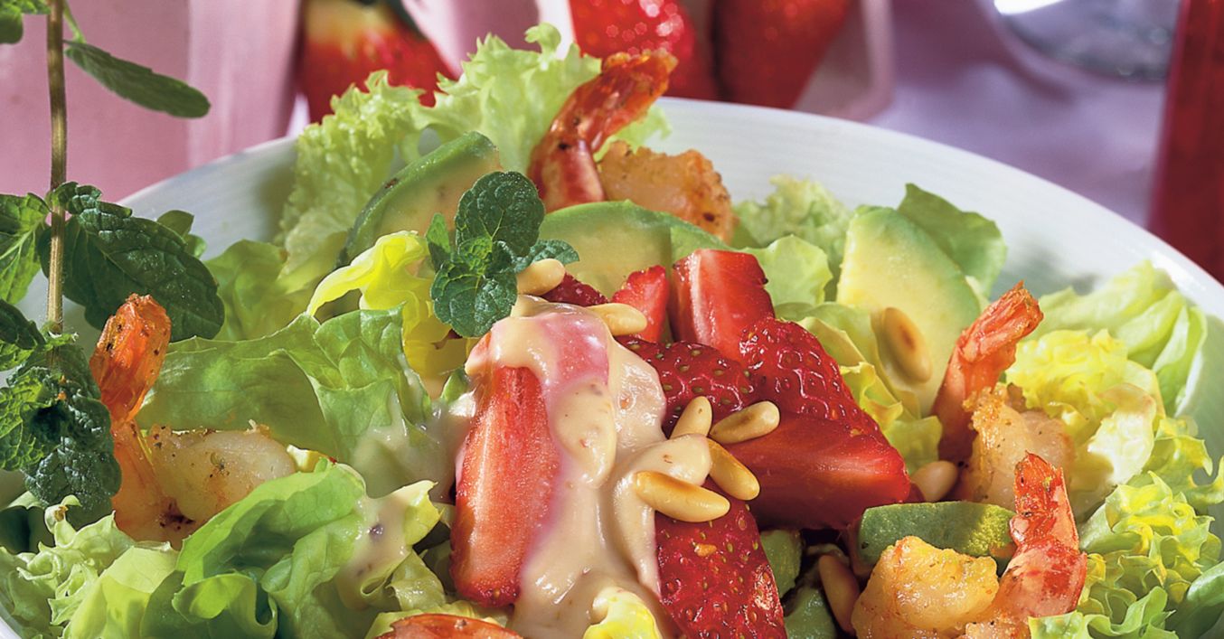 Erdbeeren, putzen, waschen, vierteln, zugeben und kurz ziehen lassen. Avocadospalten abtropfen lassen, mit Salat und Garnelen auf Tellern anrichten, Erdbeerdressing darüber verteilen und mit Pinienkernen bestreuen. Nach Wunsch mit Zitronenmelisse garniert servieren.