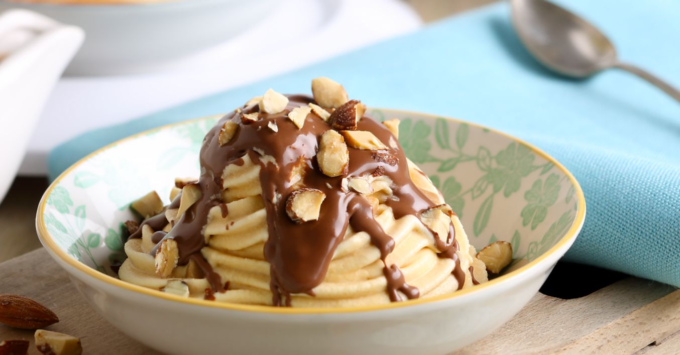 Für die Vanillesoße Vanilleschote der Länge nach aufschneiden, das Mark mit einem spitzen Messer herauskratzen und mit restlicher Milch (4 Esslöffel beiseitestellen) und Vanillezucker aufkochen. Stärke mit beiseite gestellter Milch verrühren und in die kochende Milch einrühren. Für die Schokosoße Schokolade grob hacken. Sahne erhitzen und die Schokolade darin schmelzen lassen. Mandeln grob hacken.