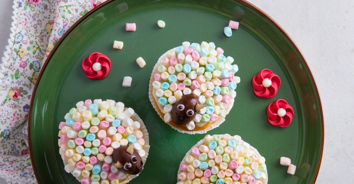 Je eine Praline als Schafkopf an die Muffins setzen. Marshmallows in kleine Stücke schneiden und als Schäfchenfell andrücken. Mithilfe der übrigen Glasur und Schokoperlen die Schäfchen mit Augen verzieren. Münder und Nasen mit der Zartbitterschokolade dekorieren und Schäfchen trocknen lassen.