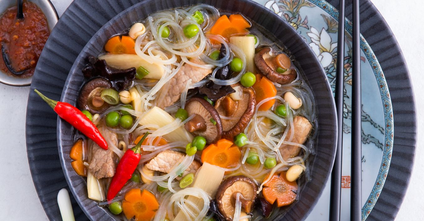 Möhren schälen, waschen, nach Wunsch der Länge nach vier Kerben einschneiden und Möhren in Scheiben schneiden. Frühlingszwiebeln waschen, putzen und in Ringe schneiden. Öl in einem Topf erhitzen, Fleisch darin kurz anbraten, vorbereitetes Gemüse und Erbsen dazugeben, andünsten, Brühe angießen, aufkochen und ca. zehn Minuten köcheln lassen. Bambussprossen, Sojabohnenkeime und Chilischoten waschen, mit Glasnudeln und Pilzen in die Suppe geben und ca. fünf Minuten ziehen lassen. Suppe mit Sambal Oelek abschmecken.