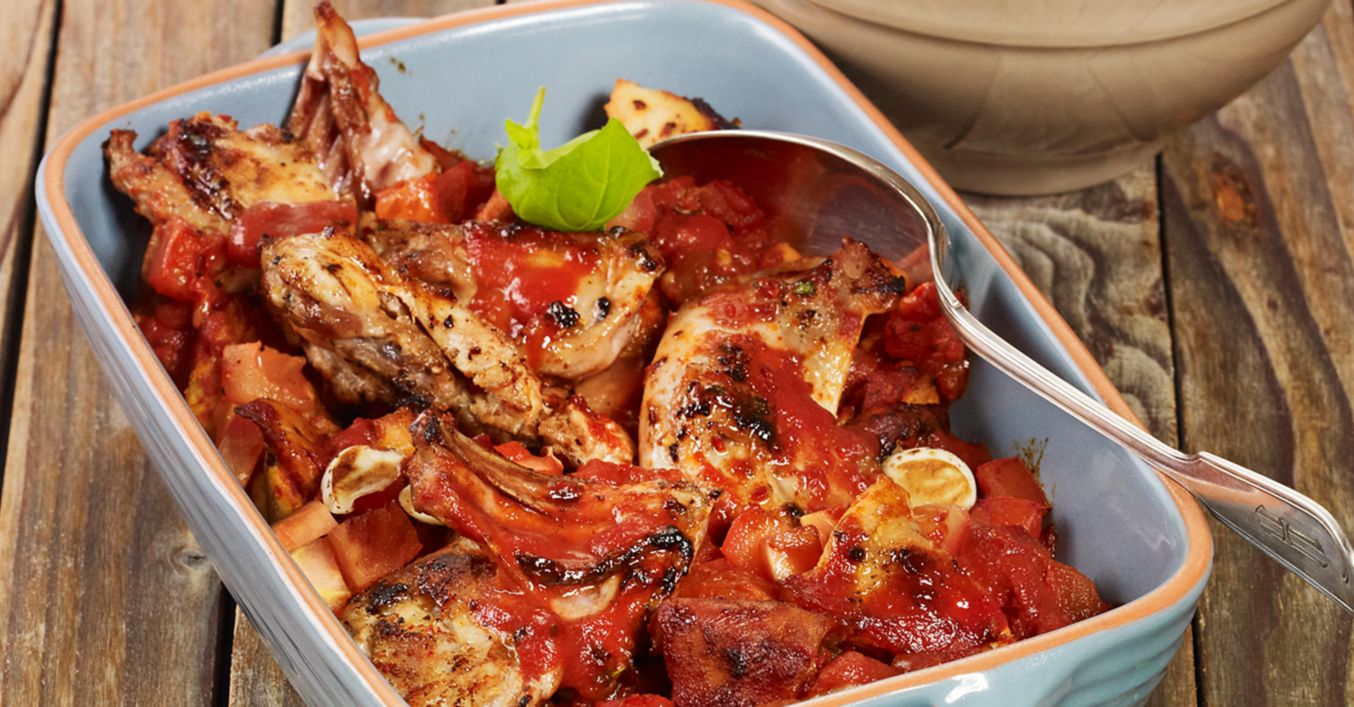 Tomaten und Ajvar zugeben und Kaninchen abgedeckt im vorgeheizten Backofen bei 180 °C (Umluft: 160 °C) circa 50 Minuten garen.