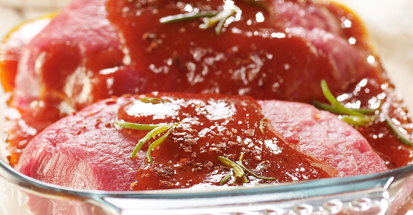 Filet trocken tupfen. Öl, Essig, Ketchup, Tomatenmark, Chiliflocken, Rosmarin, Salz und Paprikapulver verrühren.