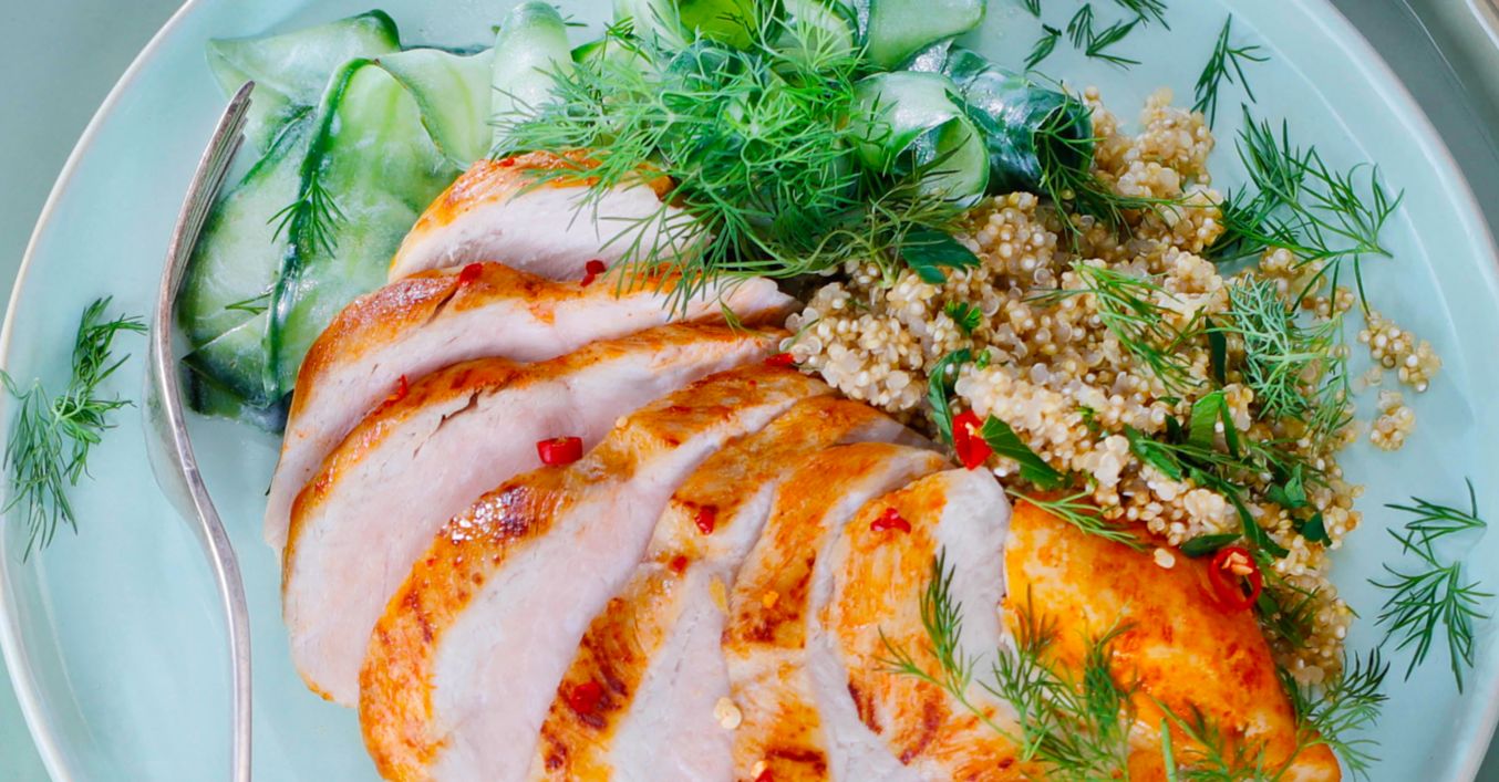 Scharfes Ofenhuhn mit Tsatsiki und Quinoa