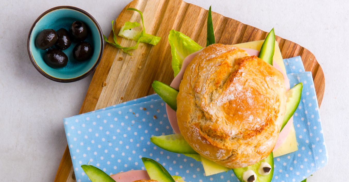 Obere Brötchenhälften als Panzer aufsetzen und den Schildkrötenkopf mit Mayonnaise und Olivenstücken ausdekorieren.