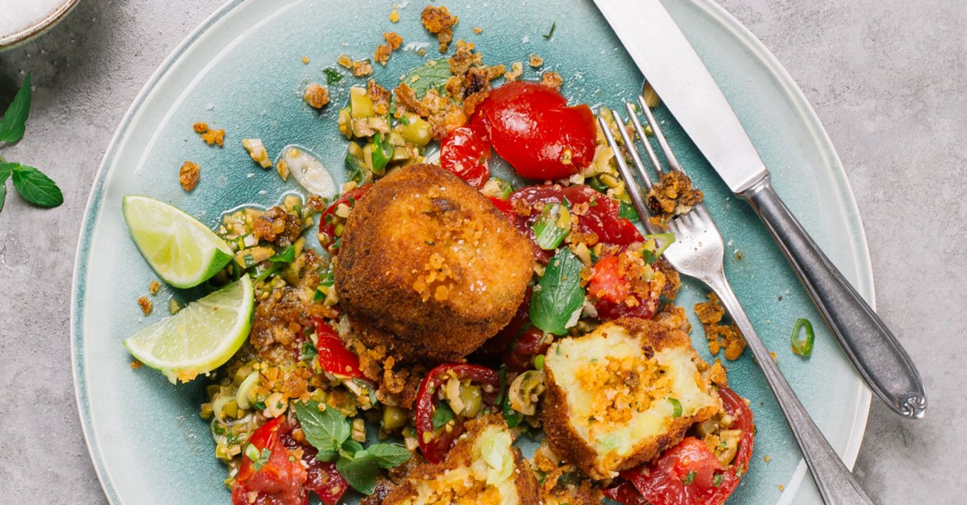 Übrige Füllung in einer Pfanne ohne Fett unter Rühren knusprig auslassen. Kartoffel-Fischbällchen und Salsa auf Tellern anrichten und mit dem Crunch bestreut servieren.