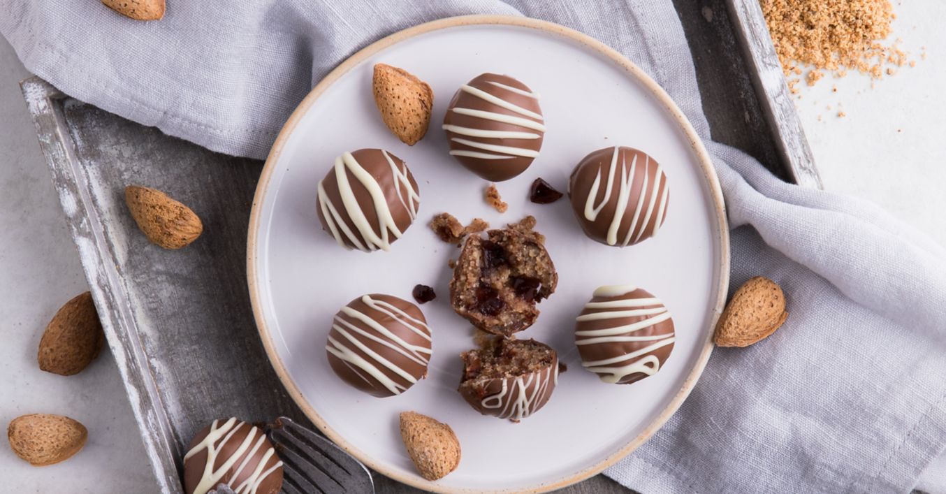 Biskuit fein zerbröseln und Kirschen fein hacken. Beides mit Mandeln und Amaretto verkneten und zu ca. 20 Kugeln formen.