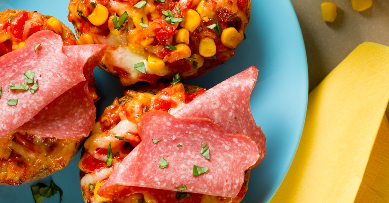 Salamischeiben auflegen und 15 bis 20 Minuten bei 180 °C Ober-/Unterhitze backen.