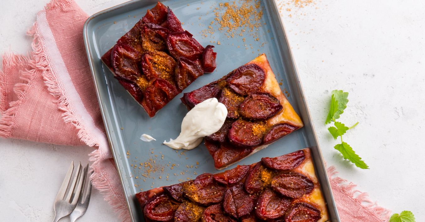 Zwetschgenkuchen in Stücke schneiden und mit Sahne servieren.