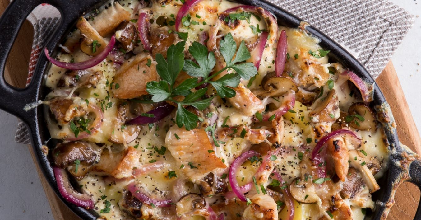 Kartoffeln gründlich waschen, als Pellkartoffeln garen, pellen und in Scheiben schneiden. Champignons putzen und je nach Größe vierteln oder halbieren. Schnitzel waschen, trocken tupfen, in mundgerechte Stücke schneiden, mit Salz und Pfeffer würzen. Zwiebeln abziehen und in feine Ringe schneiden.