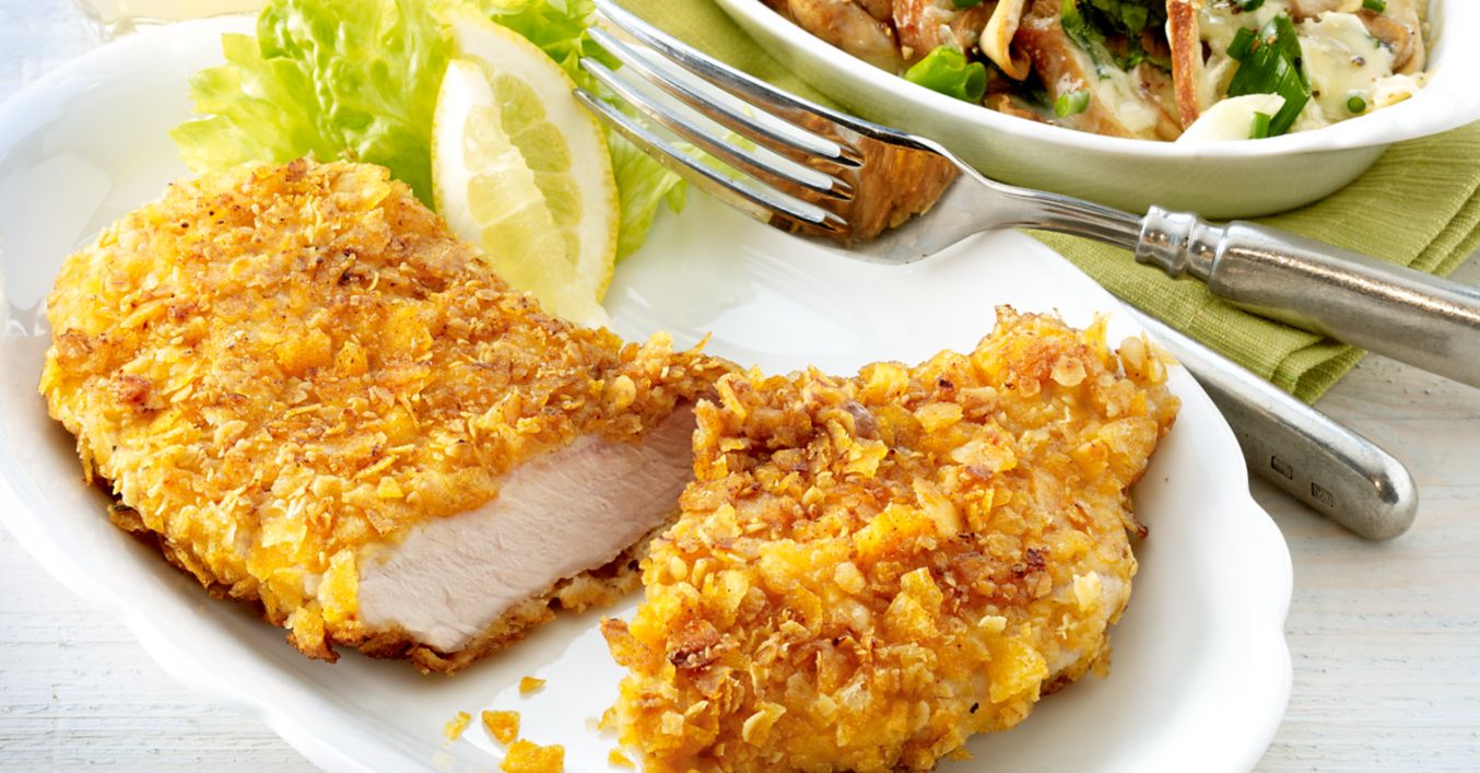 Schnitzel in Chips-Panade mit Baguette-Auflauf