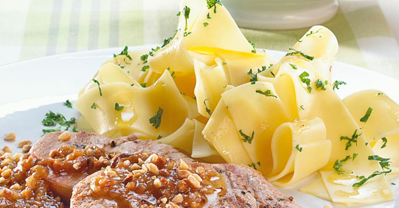 Schnitzel auf Tellern anrichten, mit Nuss-Sauce beträufeln und nach Wunsch mit breiten Kräuterbandnudeln servieren.