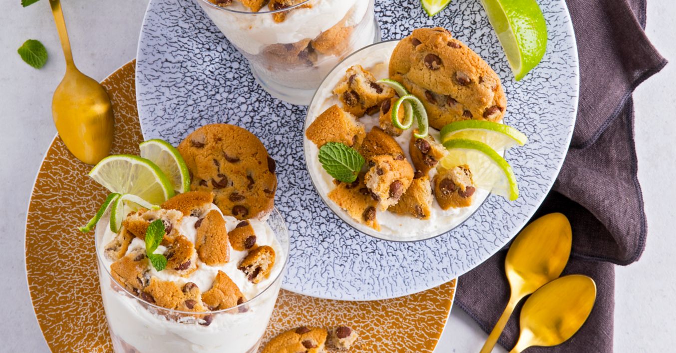 Creme und zerbrochene Cookies in Dessertgläser schichten, die restlichen Cookies vierteln und die Cookie-Creme damit garnieren.