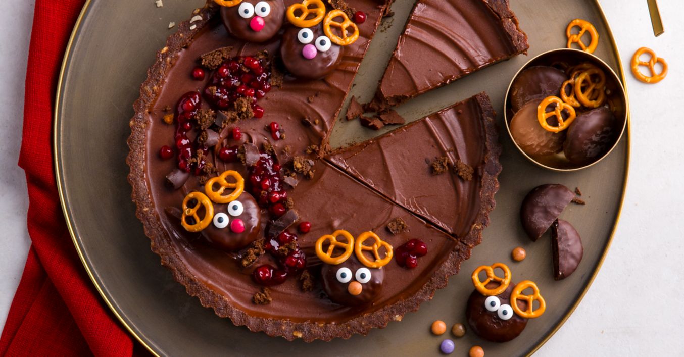 Schokoladentarte mit den restlichen Mini-Lebkuchen, Preiselbeeren und nach Wunsch mit Macarons verziert servieren.