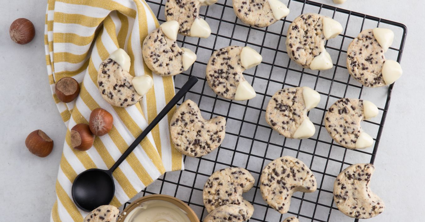 Weiße Kuvertüre in einem Topf langsam schmelzen, jeweils die Ecken der Schoko-Nussmonde hineintauchen und auf einem Rost abkühlen lassen.