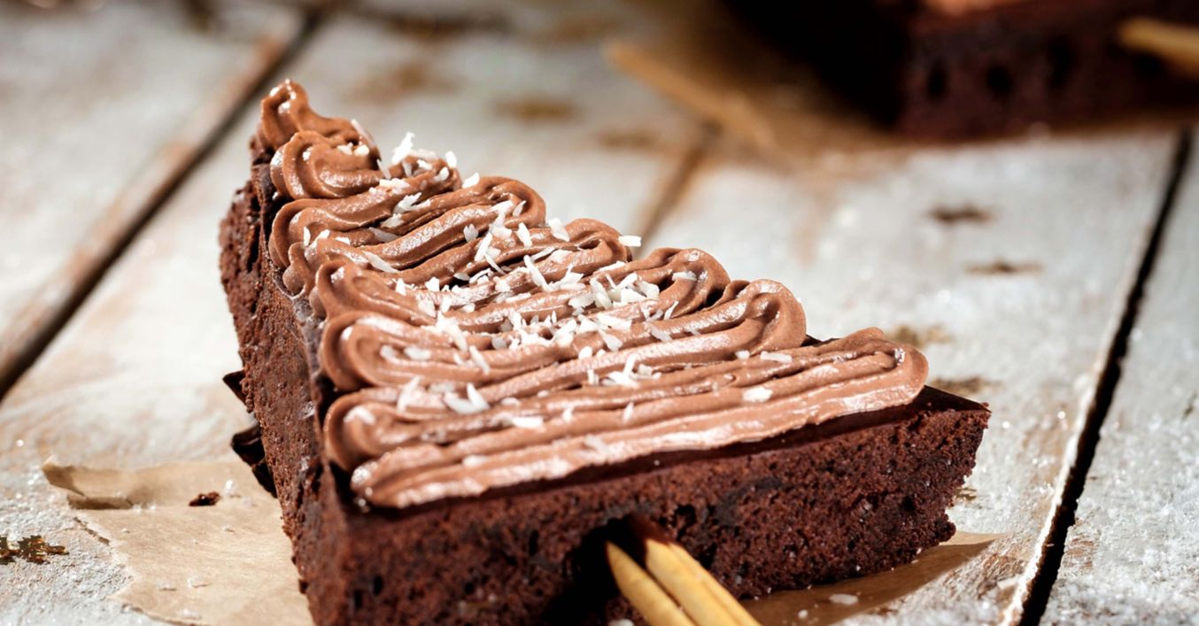 Den Boden mit einem scharfen Messer in Dreiecke schneiden und mithilfe eines Spritzbeutels die kühle Creme großzügig darauf verteilen. Nach Wunsch Kokosflocken darüberstreuen. Zum Schluss die Schokostäbchen in der Mitte durchbrechen und vorsichtig in die kurze Seite der Bäume stecken.