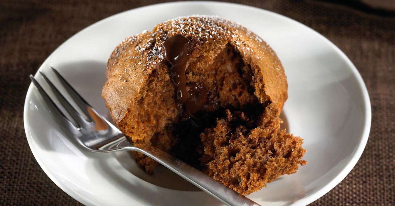 Ei mit Milch verquirlen, mit der flüssigen Schokoladen-Butter und Zucker unter die Mehl-Mischung rühren. Muffin-Blech einfetten, Teig in die Vertiefungen füllen.