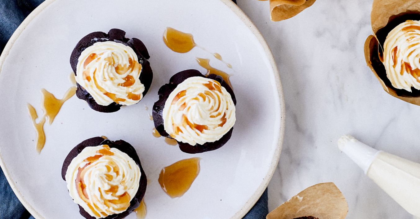 Muffins herausnehmen und circa 30 Minuten abkühlen lassen. Frischkäse mit Puderzucker verrühren und mithilfe eines Spritzbeutels mit Sterntülle die Muffins damit verzieren. Die Muffins mit Karamellsauce garniert servieren.