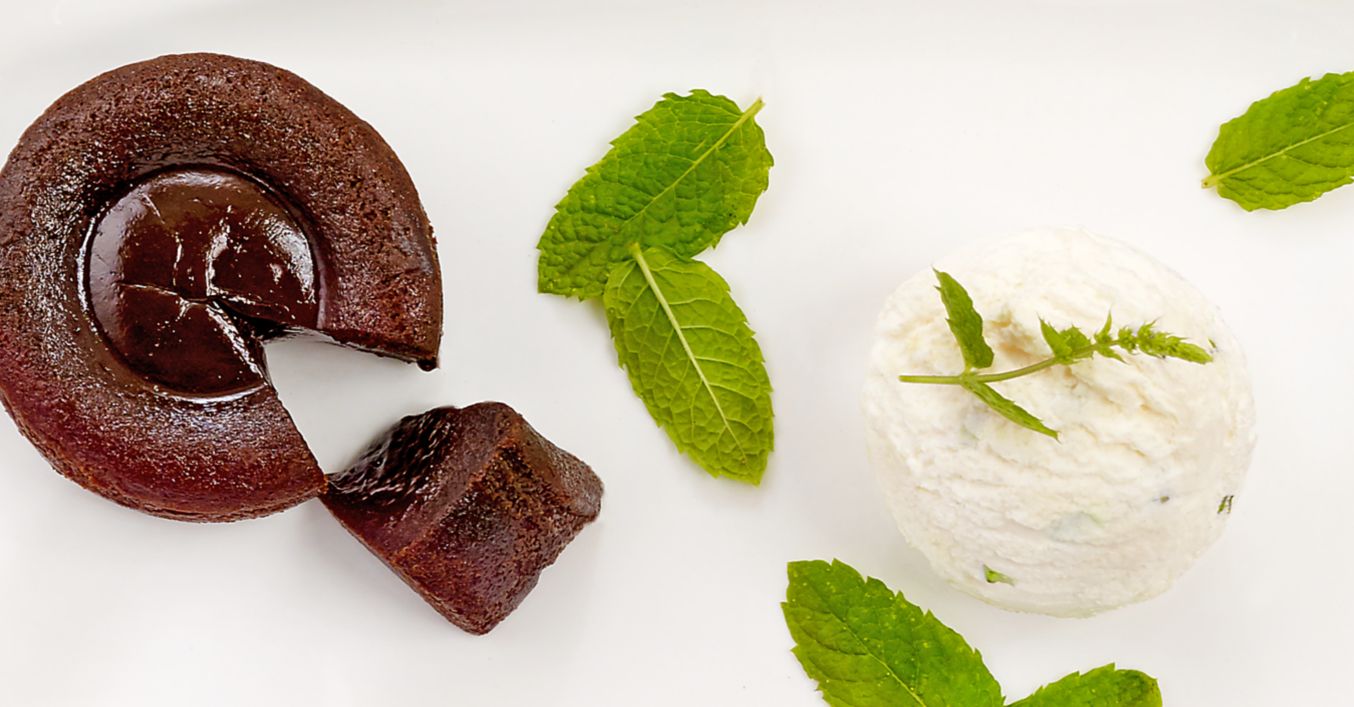 Minz-Grüntee-Eis portionieren, mit heißem Schokoladendessert auf Tellern anrichten und mit restlicher Minze garniert servieren.