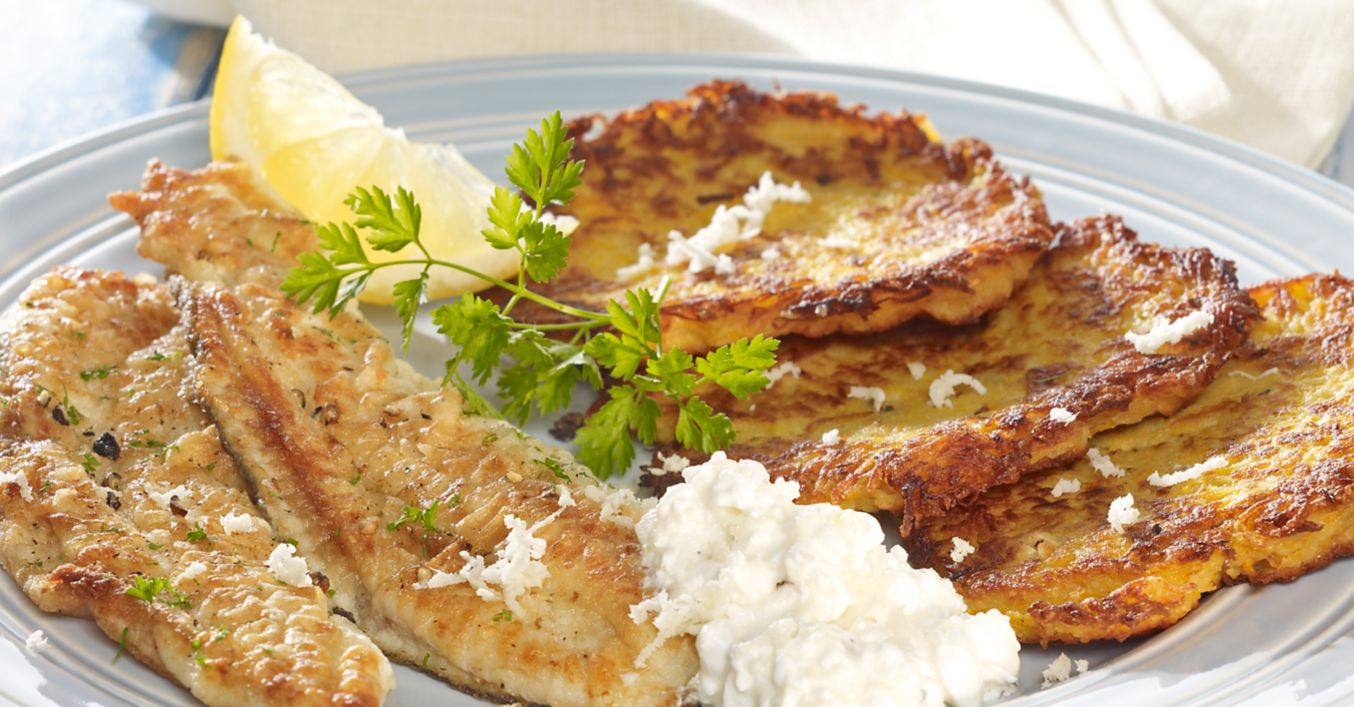 Schollenfilets, Rösti und Dip auf Tellern anrichten und servieren.