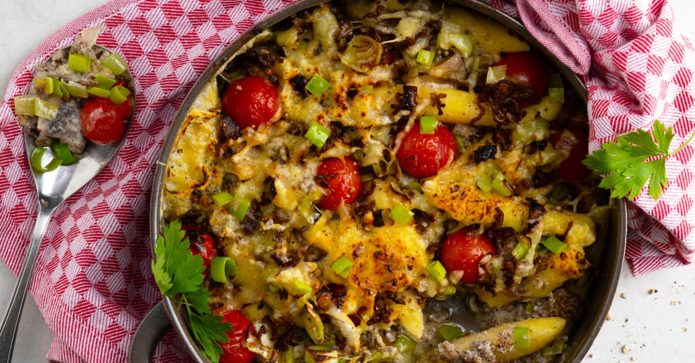 Schupfnudeln dazugeben, alles miteinander vermengen und gleichmäßig in eine Auflaufform füllen.