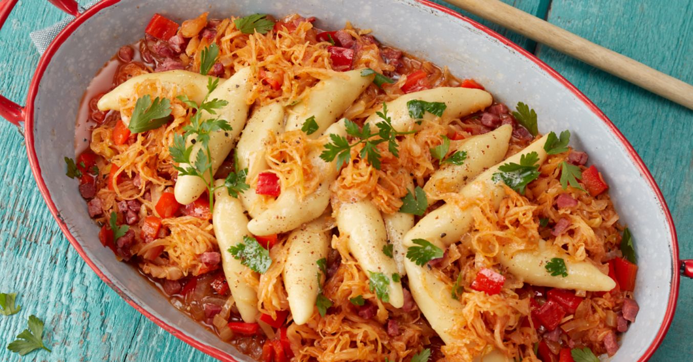 Das Sauerkraut mit einer Gabel auflockern, in den Topf geben und ebenfalls kurz andünsten. Die Brühe angießen. Mit Paprikapulver würzen, einen Deckel auflegen und das Kraut bei kleiner bis mittlerer Hitze 30 Minuten schmoren.
