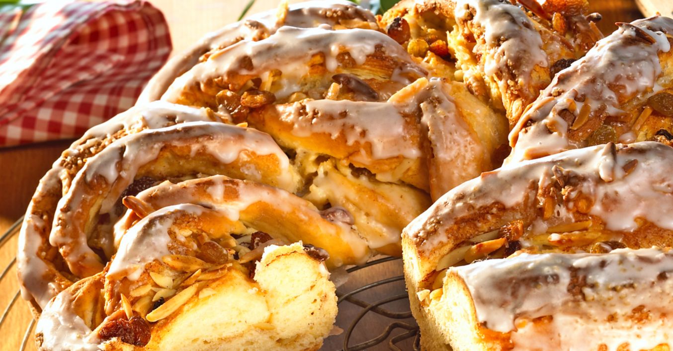 Teig von der breiten Seiten her aufrollen und der Länge nach durchschneiden. Teigstreifen miteinander verschlingen, auf ein mit Backpapier ausgelegtes Backblech zu einem Kranz zusammenlegen und circa 40 Minuten backen (Elektro- und Erdgasbackofen 200 °C/Stufe 4, Umluft 180 °C). Bei zu starker Bräunung Kranz mit Backpapier abdecken.