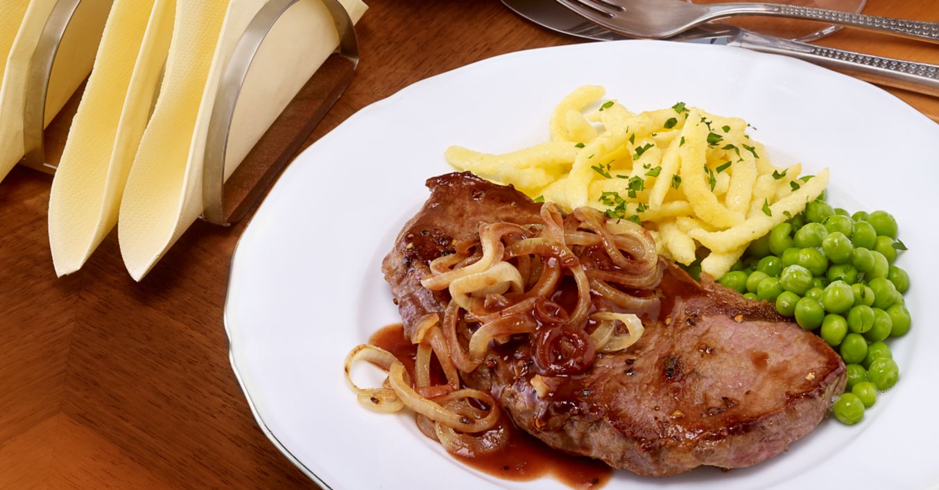 Steaks mit Zwiebelsoße, Erbsen und Spätzle auf Teller anrichten und servieren.