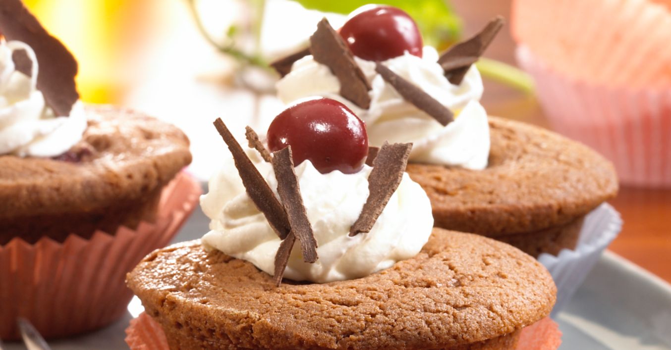 Muffins aus der Form lösen und abkühlen lassen. Sahne mit Vanillezucker, Sahnesteif und Kirschwasser steif schlagen, in einen Spritzbeutel füllen und auf den Muffins verteilen.