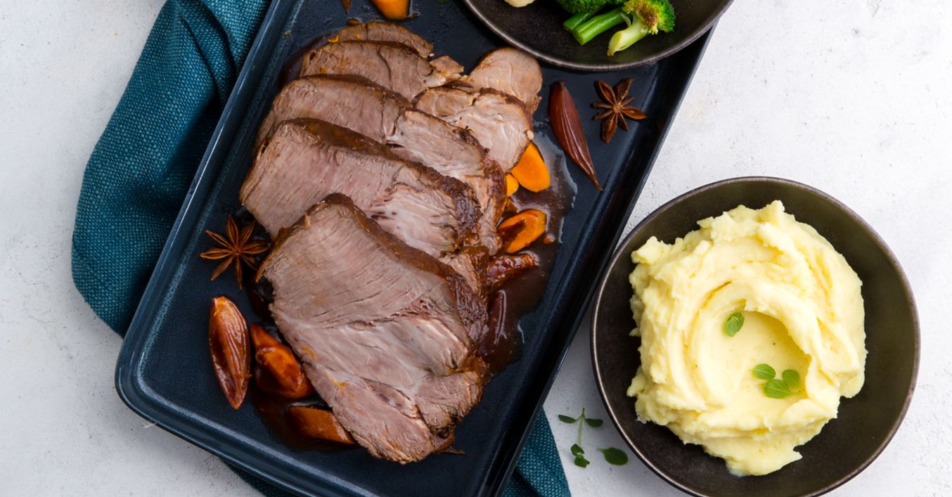 In der Zwischenzeit Möhren schälen, längs halbieren, in ausreichend Salzwasser circa 5 Minuten bissfest garen und abschrecken. Kartoffelpüree nach Packungsanweisung mit Milch zubereiten und warm stellen. Braten aus der Soße nehmen und ebenfalls warm stellen.