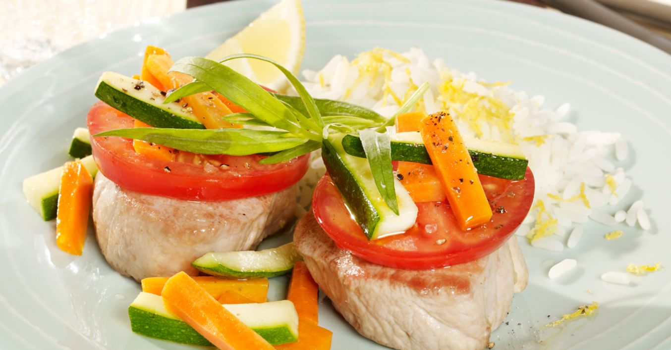 Möhre sowie Zucchini waschen und beides in feine Stifte schneiden, die Tomaten in Scheiben schneiden. Die Schweinemedaillons, salzen und pfeffern, in der Pfanne in erhitzten Öl von beiden Seiten kurz anbraten und aus der Pfanne nehmen. Die Gemüsestreifen ebenfalls kurz in der Pfanne andünsten und mit Salz und Pfeffer abschmecken.