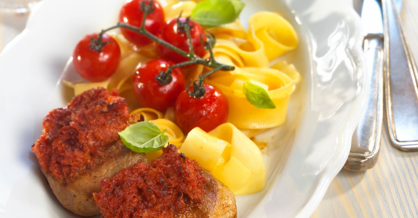 Das Fleisch zu Medaillons schneiden, in restlichem Öl von allen Seiten anbraten, mit Salz und Pfeffer würzen. Medaillons mit Pesto bestreichen und im vorgeheizten Backofen bei 180 Grad (Umluft: 160 Grad) ca. 10 Minuten gratinieren. Kirschtomaten nach 5 Minuten dazugeben.