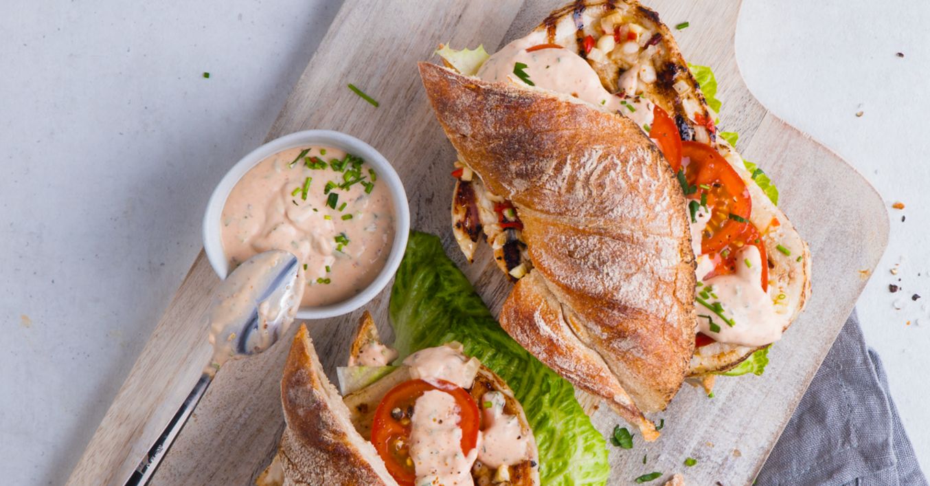 Die untere Baguettehälfte zuerst mit Salat, jeweils 2 Minutensteaks und Tomatenscheiben belegen. Die restliche Creme darauf verteilen, mit etwas schwarzem Pfeffer aus der Mühle bestreuen und mit der oberen Baguettehälfte bedecken.