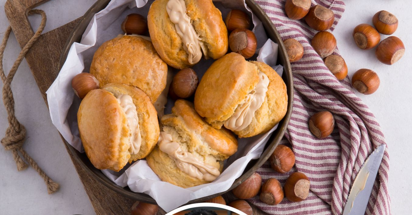 Scones halbieren und mit Kikis Cream Hazel bestreichen.