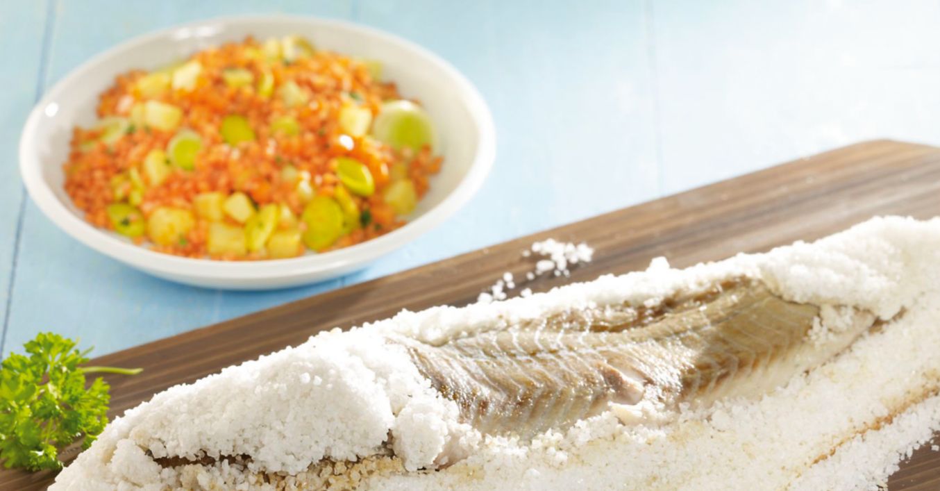 Den Fisch auf das Salzbett legen, mit Meersalz abdecken und gut andrücken. Die Alufolie verschließen und den Fisch im vorgeheizten Backofen bei 240 Grad (Gas: Stufe 6, Umluft: 220 Grad) circa 30 Minuten garen.
