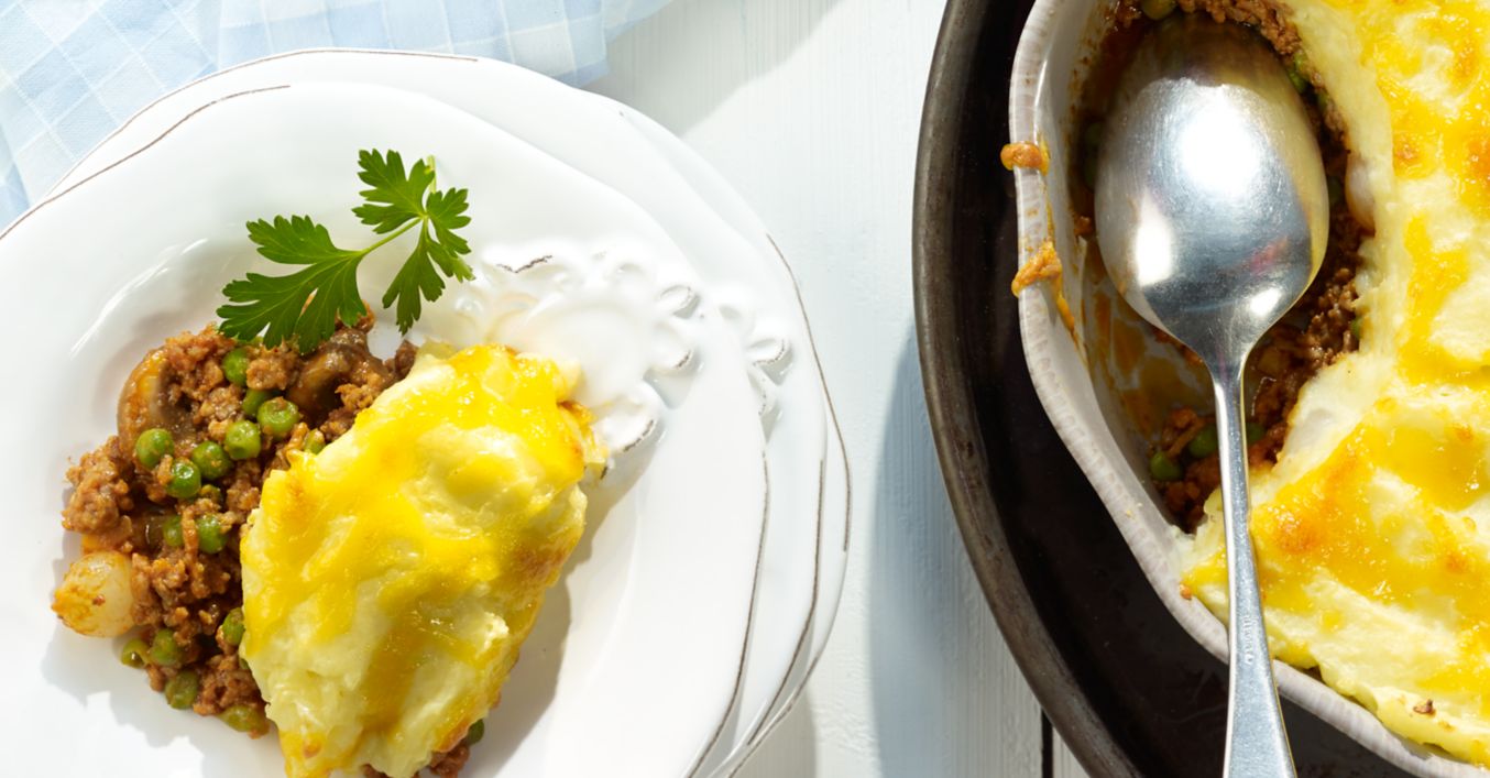Kartoffeln abgießen, mit Milch und Butter zerstampfen, mit Muskat, Salz und Pfeffer abschmecken und gleichmäßig auf der Hackfleischmischung verstreichen. Cheddar überstreuen und den Pie im vorgeheizten Backofen bei 180 °C (Gas: Stufe 3, Umluft 160 °C) circa 25 bis 30 Minuten garen.