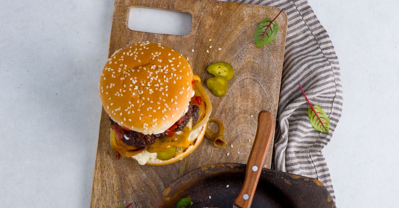 Auf die untere Hälfte des Brötchens etwas Mayonnaise, Gurkenscheiben und angerösteten Zwiebelringe verteilen. Das doppelte Patty mit dem geschmolzenen Cheddar darauf legen. Einen Klecks Ketchup und Mayonnaise auf den Deckel des Brötchens auftragen und Deckel auf den Burger setzen.